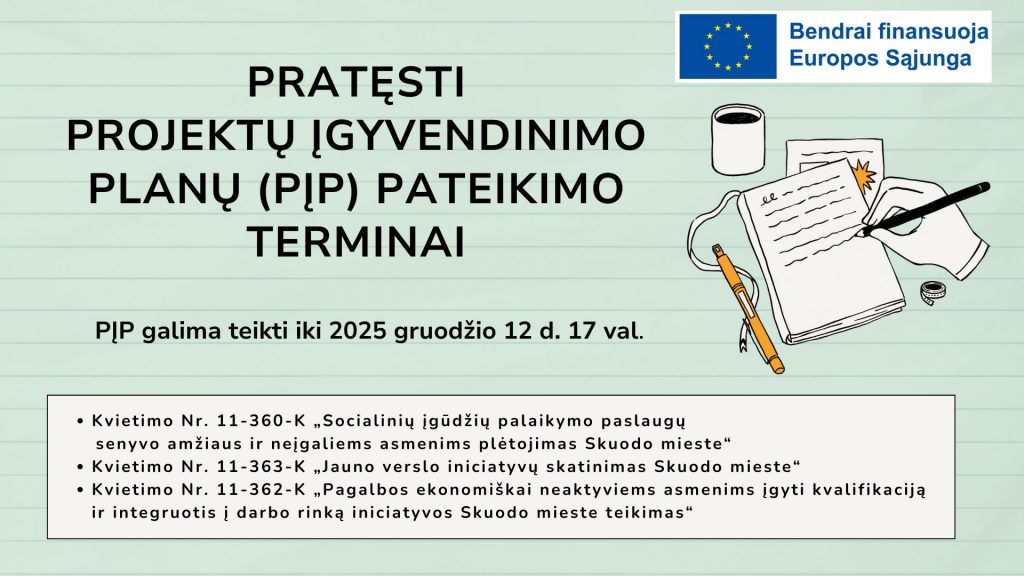 Informuojame, jog pratęsti projektų įgyvendinimo planų (PĮP) pateikimo terminai šiems Kvietimams: