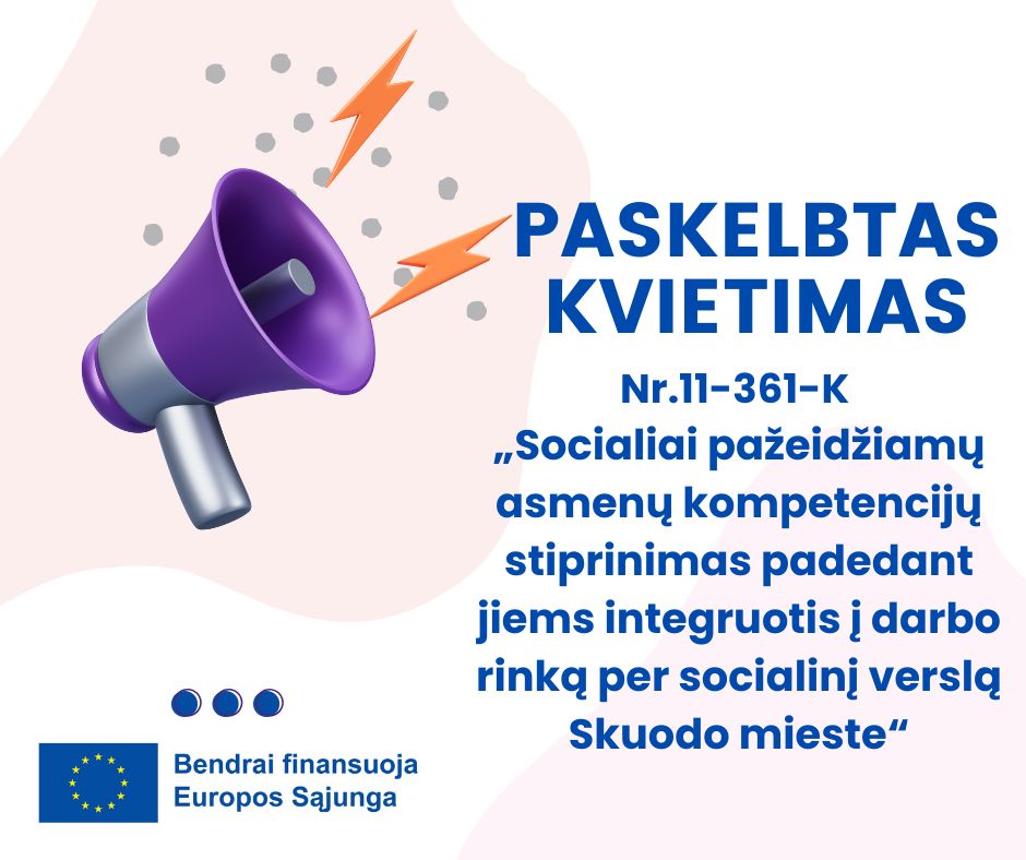 PASKELBTAS KVIETIMAS Nr. 11-361-K „SOCIALIAI PAŽEIDŽIAMŲ ASMENŲ KOMPETENCIJŲ STIPRINIMAS PADEDANT JIEMS INTEGRUOTIS Į DARBO RINKĄ PER SOCIALINĮ VERSLĄ SKUODO MIESTE“
